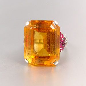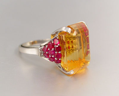 18k RING WITH A 30 Ct CITRINE WITH RUBIES AND DIAMONDS: 18K white gold ring centers a large approx. 30 ct. emerald cut citrine. Rated VVS in clarity (Type I), oY in Hue, 3 in Tone and 3 in Saturation. The shank is set with 18 round mixed cut rubies. WEIGHT: 1.65 Ct. Approx. Rated VS-SI in clarity (Type II), slpR in Hue, 4-5 in Tone and 4 in Saturation. Accented with 4 round single cut diamonds. WEIGHT: .08 Ct. Approx. Rated VS in clarity and G-H in color. Weight: 16.7 grams. Size: 7.5 Est. $625/775**