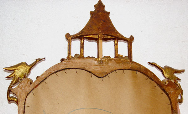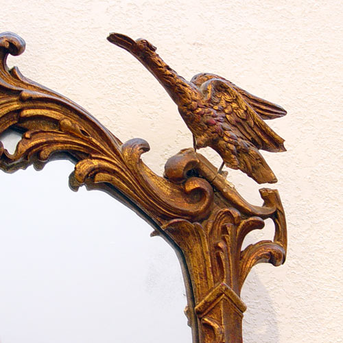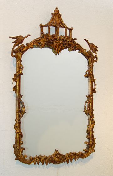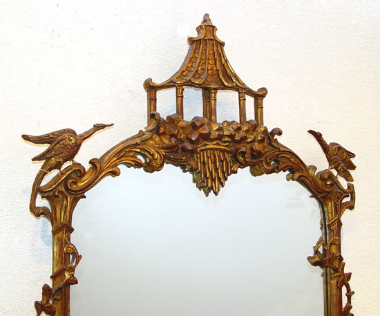 CARVED GILTWOOD CHINESE CHIPPENDALE MIRROR: Ca. 1880-1915. Pagoda and bird motif. Approx. 57'' x 31''