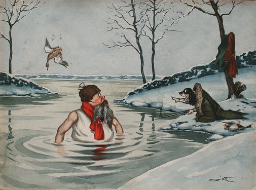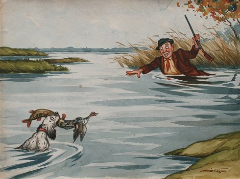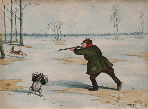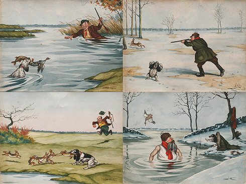 O'KLEIN, Boris, (French, 20th C.): 4 piece suite of Comedic Hunt Scenes, Watercolors, 10 5/8'' x 14 1/2'', signed, unframed. Sold as a lot. Condition - Each piece has faint sporadic foxing, no tears noted, not mounted. Est. $300/500**