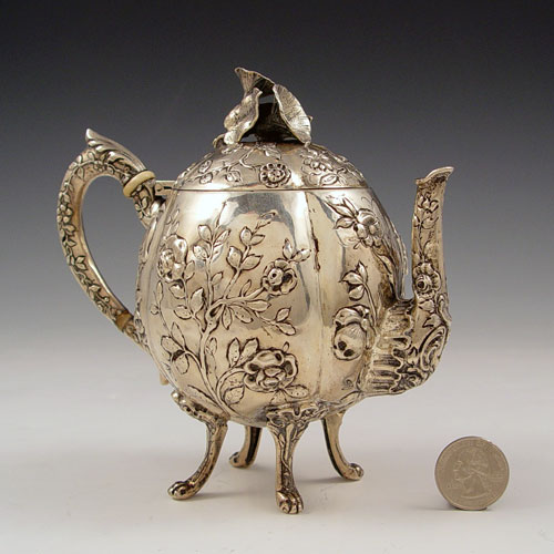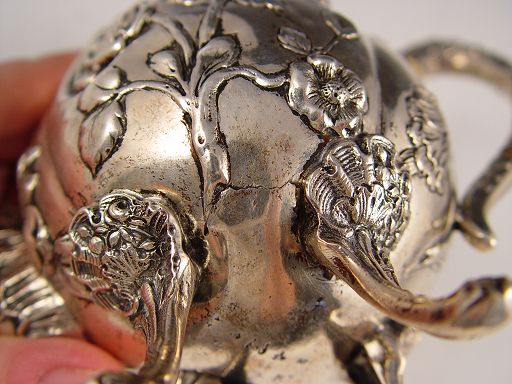 GERMAN 800 SILVER REPOUSSE TEA POT: Floral repousse design with applied handle hinged top. Unknown German makers hallmark. Approx. 8.4 troy oz. Measures 5 1/2'' high x 5 1/2'' wide. Note crack near base.