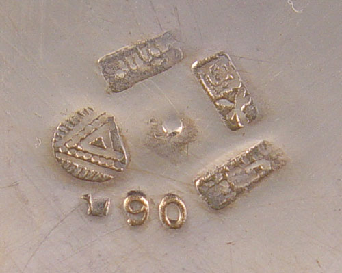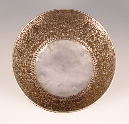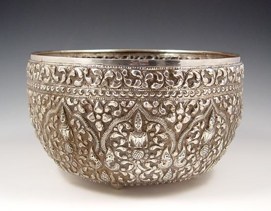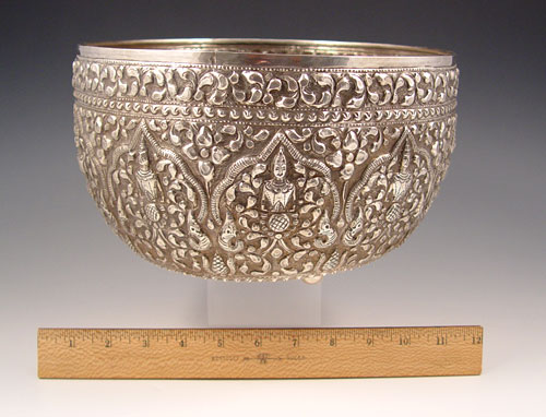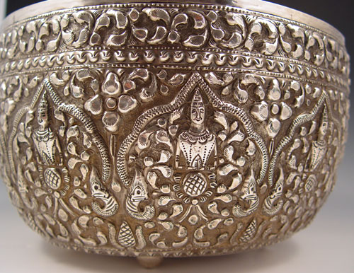 CHINESE FINE SILVER REPOUSSE BOWL WITH BUDDHIST FIGURES: Turn of the century center bowl with repousse designs of Buddhist figures and floral motifs. Unknown Chinese makers hallmarks on footed base. Approx. 18.8 troy oz .900 silver. Measures 5 7/8'' high x 10 1/8'' dia. Note slight bends, split in rim. Est. $300/500**