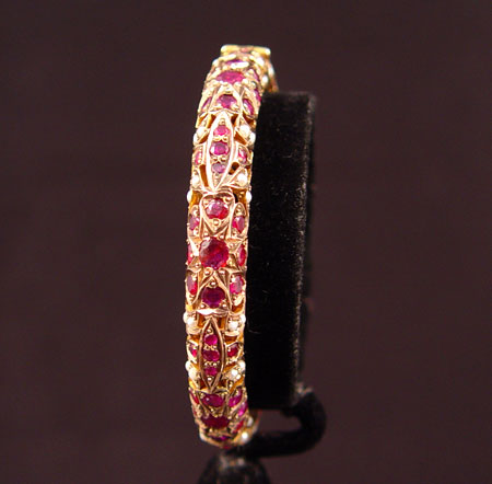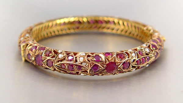 9K RUBY AND SEED PEARL BANGLE BRACELET: 9K yellow gold bangle bracelet contains 88 round mixed cut rubies, approx. 8.00 Ctw. Accented with 54 seed pearls (2 pearls are missing). The rubies and pearls are prong set. Filigree hinged bangle with locking closure and figure eight safety clasp. Weight: 37.9 grams. Approx. 2 1/4'' diameter.