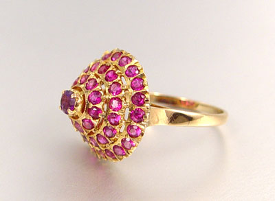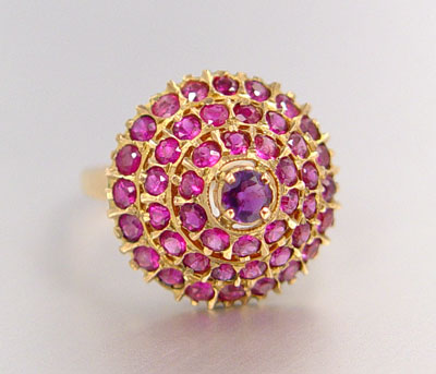 2.5 CT RUBY PRINCESS RING: 10K yellow gold ring contains 46 round mixed cut rubies, total weight approx. 2.50 Ct. At the center is a round mixed cut amethyst (replacement). The stones are prong set. Weight: 5.6 grams. Size: 10.5