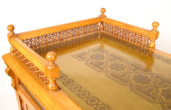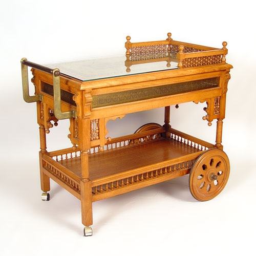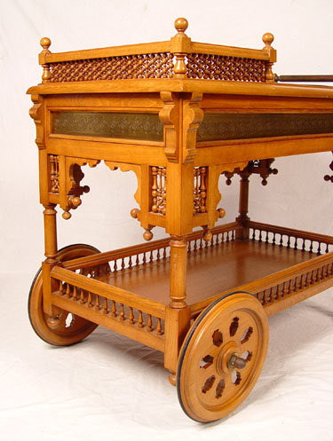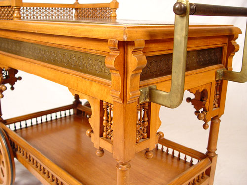EGYPTIAN MASHRABIYA TEA CART WITH FRETWORK: Two tier cart with brass handle, glass top. Measures 35'' high x 40 1/2'' x 21 1/2''.
