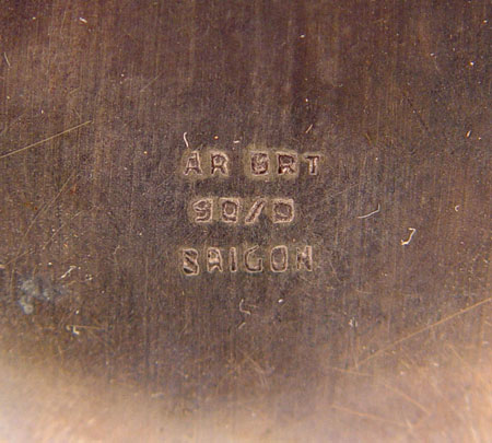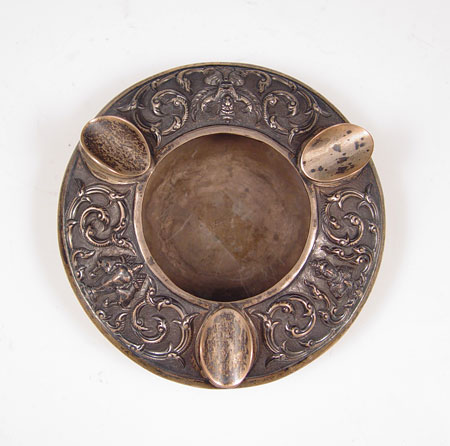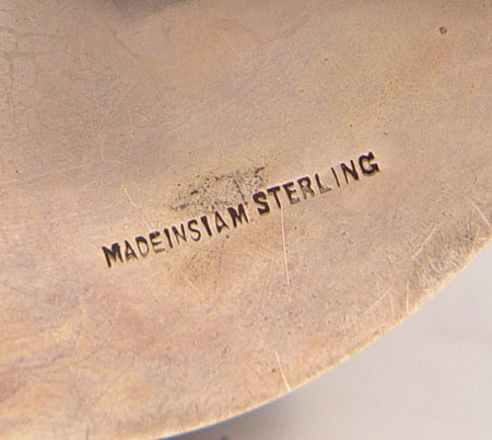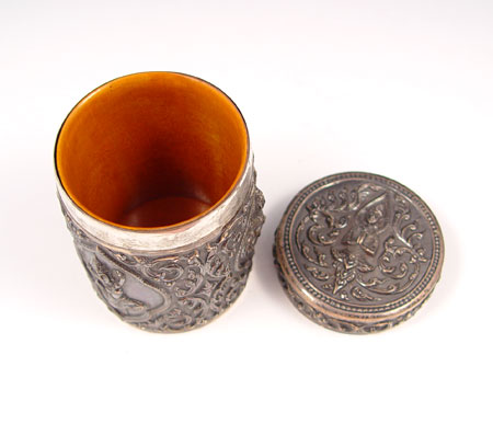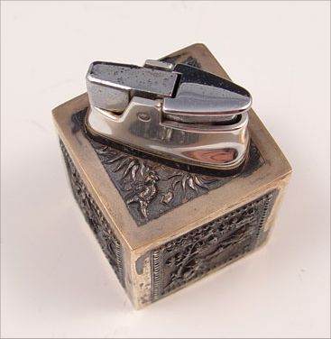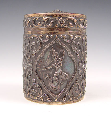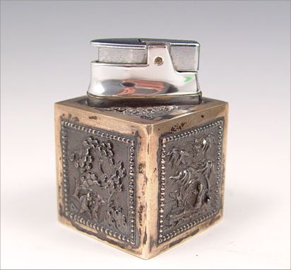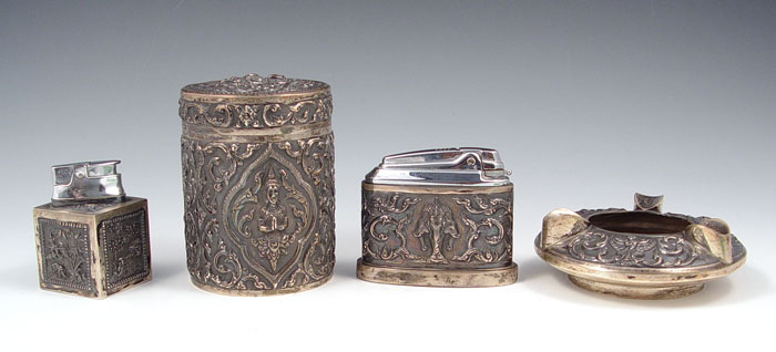 4 PIECE ORNATE SIAM STERLING SMOKING SET: To include 1) Table lighter featuring Hindu gods, sterling outer case, measures 2 3/4'' high x 3 1/4'' long. 2) Table lighter featuring oriental scenes, sterling outer case, measures 2 1/2'' high x 1 5/8'' square. 3) Ashtray featuring Hindu gods, measures 1 1/8'' high x 4 1/4'' dia, note small dent in side. 4) Wood lined cigarette case / humidor featuring Hindu gods and garland designs, measures 4 1/8'' high x 3'' dia.