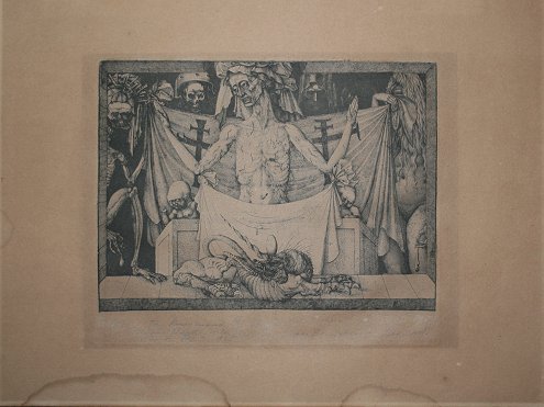 FUCHS, Ernst, (Austrian, 1930-): ''In Erwartung der Auferstehung'' (from Die Passion des Einhorns), Etching, 10 3/8'' x 14'', pencil signed, dated 1952, numbered 44/60, dedicated to Raymond A. Whyte, ''To His Work, - to the Victory over the Horror of Mod. Art. Vienna, Okt. 3, 1965''. Overall toning, moisture evident in lower and left margins.