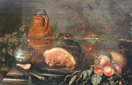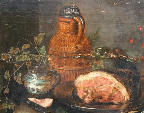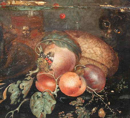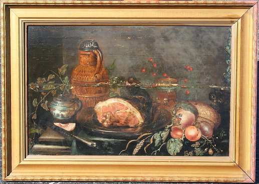 SUPERIOR OLD MASTER STILL LIFE PAINTING FLEGEL?: Depicts haunch of red meat, several German or Austrian vessels, fruit and melons, butterfly and a cute black cat looking on, Oil/Chamfered Wood Panel, 18'' x 28'', signature lower left probably added, encased in a much later gold frame with wear, 24 1/'' x 34 1/2''. In the style of Georg Flegel, a 17th C master still life painter. Condition: Repair to horizontal crack, sporadic in-paint throughout with paint loss, sold as is.