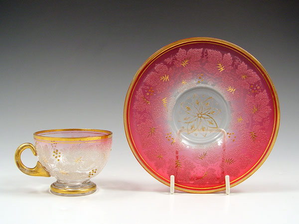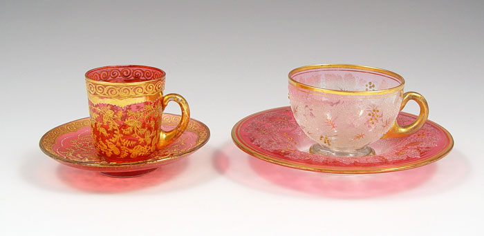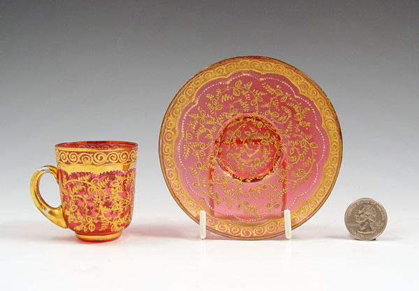 2 MOSER CRANBERRY GLASS DEMI-TASSE CUPS & SAUCERS: 1) Cranberry overshot in a grape and vine design, the cup is cranberry fading to clear, the saucer with a clear center. Saucer is 5 1/2'' dia., the cup is 2 3/4''. 2) Cranberry with a heavy gilt fern design, saucer is 4'' dia., cup is 1 2/3'' dia.