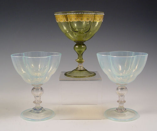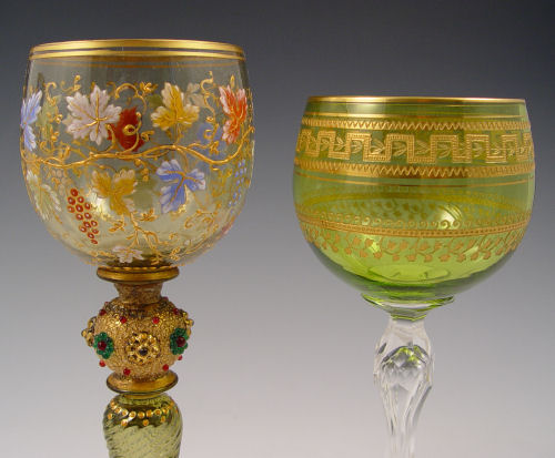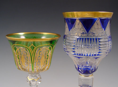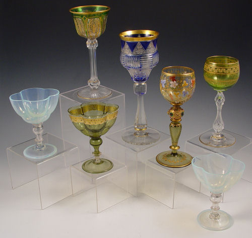 COLLECTION OF 7 MOSER GLASS STEMS: Moser and Moser quality, 6 different designs and shapes rich in decoration to include enameled, cut to clear, clam broth, and gilt. 4 3/4'' - 8 1/2''.