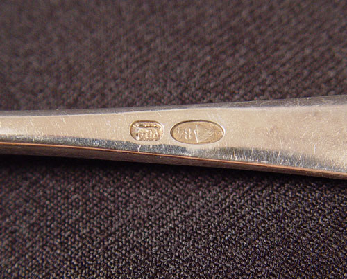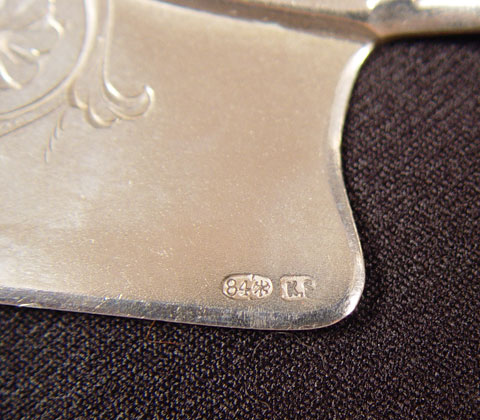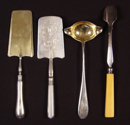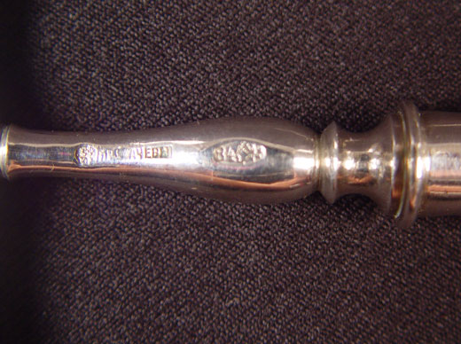 2 RUSSIAN SILVER CAVIAR SHOVELS & GRAVY LADLE: To include 1) Carl Selenius 1896 St Petersburg 84 Zolnik mark, engraved shovel, monogrammed. 9 1/8'' long. 2) Illegible maker 1899-1908 St Petersburg 84 Zolnik mark, vermeil top shovel, monogrammed. 10'' long. 3) Illegible maker 1908-1926 St Petersburg 84 Zolnik mark gravy ladle, vermeil bowl interior, monogrammed. 8 3/4'' long. Approx. 10.6 troy oz. Also include metal marrow scoop with ivory appearance grip. 10 1/8''.