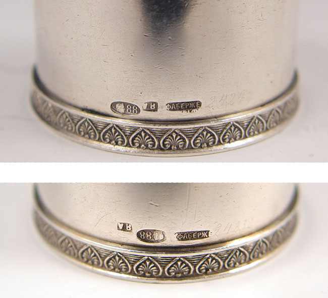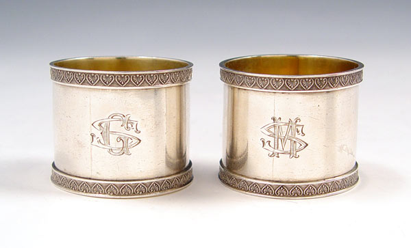 PAIR FABERGE RUSSIAN SILVER NAPKIN RINGS: 1908-1926 St. Petersburg 88 Zolnik mark with workmaster's initials AR, a recognized Faberge workmaster. Monogrammed GS & MS. Measures 1 3/8'' high x 1 5/8'' dia. Approx. 3.1 troy oz