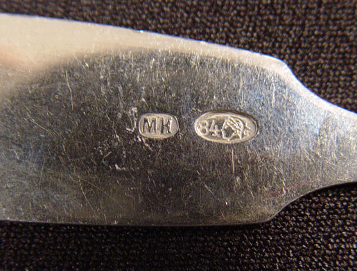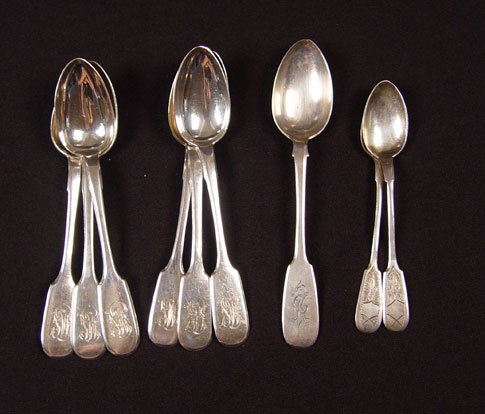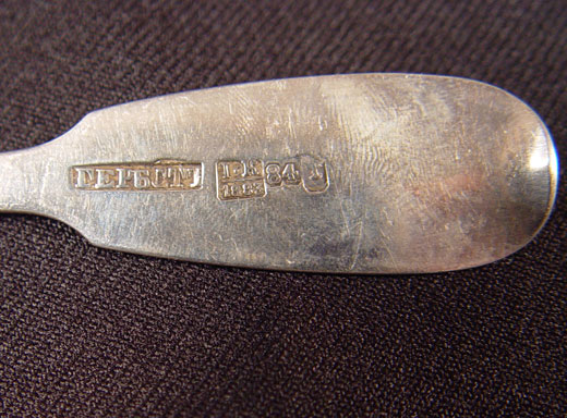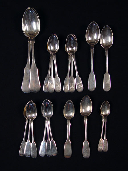 20 PIECE ESTATE COLLECTION RUSSIAN SILVER SPOONS: 20 piece assorted sizes and makers. All 84 Zolnik marked. Many monogrammed. Includes serving spoons and teaspoons. Approx 21.3 troy oz.