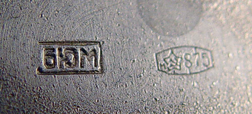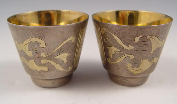PAIR RUSSIAN SILVER SHOT GLASSES: Circa 1950's Moscow mark. Engraved decoration of lion and scroll with vermeil interior. Measures 1 5/8'' high x 2 1/8'' dia. Approx 3.4 troy oz .875 silver.