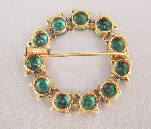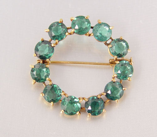 18K CIRCLE BROOCH OF 16.50 CT. TOURMALINE: 18K yellow gold circle shaped brooch contains 11 round mixed cut tourmaline. Weight: 16.50 Ct. Approx. Rated SI in clarity (Type II), BG/GB in Hue, 4 in Tone and 2-3 in Saturation. The tourmaline are prong set. Bar pin closure. Weight: 10.3 grams. 1 /38'' diameter. Est. $550/600**