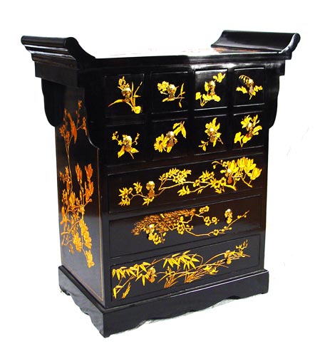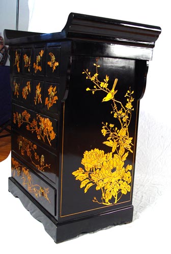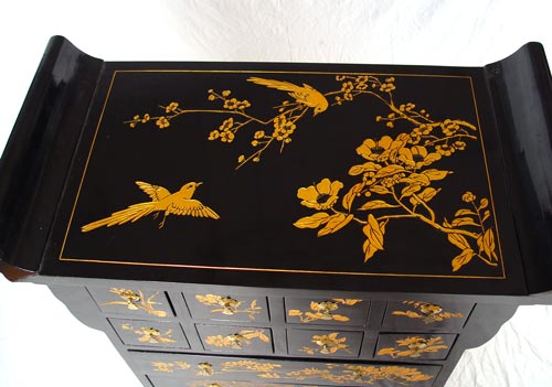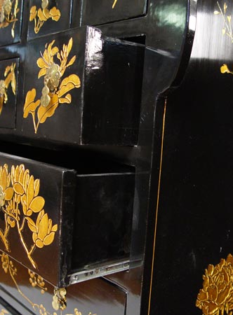 GOLD DECORATED CHINESE MULTI DRAWER CABINET : Measures 40'' high x 36'' wide x 18'' deep.