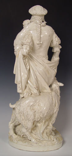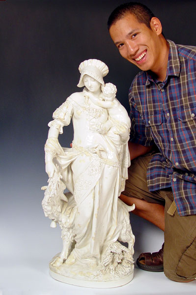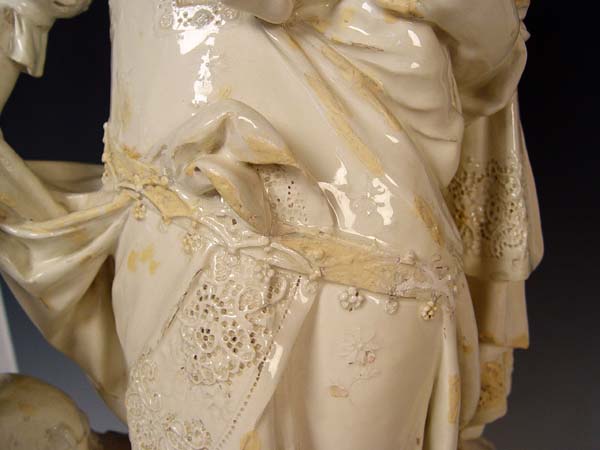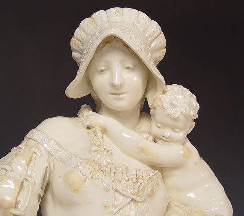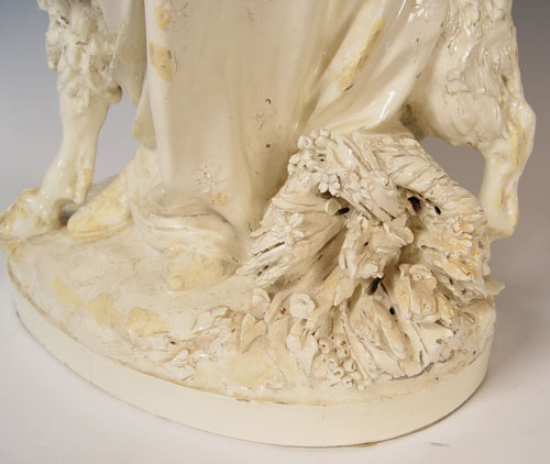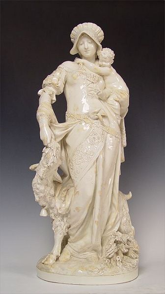ALBERT ERNEST CARRIER-BELLEUSE TERRACOTTA SCULPTURE: 34'' tall, depicts a woman holding a child, while feeding a goat, incised signature. Numerous repairs, scattered chips to glaze, sold as is. Est. $800/1200**