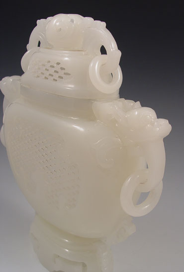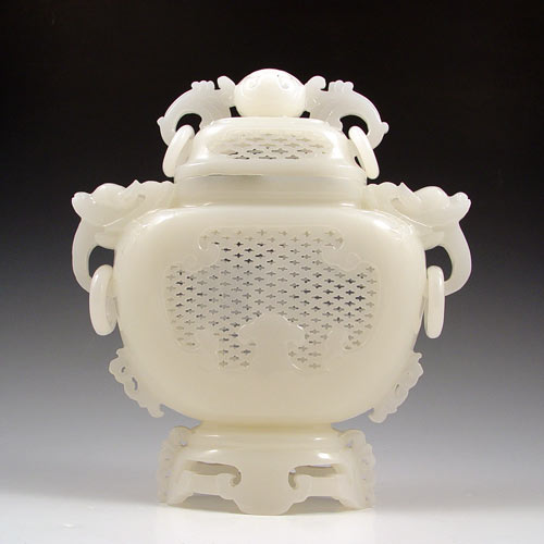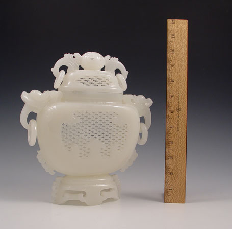 CHINESE CARVED WHITE JADE CENSOR: 10'' high x 9'' x 2 1/2''