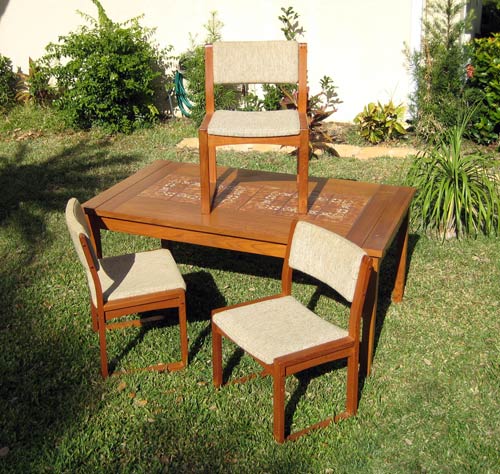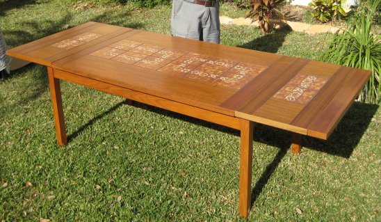 DYRLUND DANISH MODERN TABLE & 3 CHAIRS: Ceramic Tile Table with 2 extensions, with 3 chairs. Table measures 28 1/2'' high x 63 3/4'' (add 32'' for the leaves) x 36'' w. Chairs measures 31 3/4'' high x 21 1/4'' x 20''