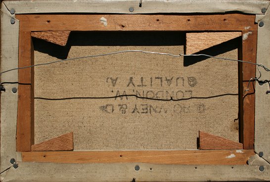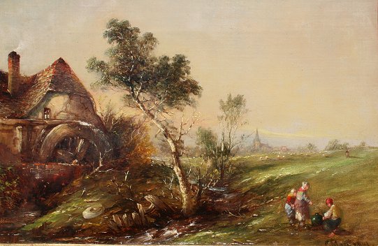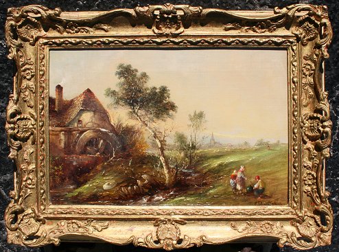 MONTAGUE, Clifford, (English, 19/20th C): Dutch Landscape Mill & Figures, oil on canvas, 8'' x 12'', signed lower right, illegibly signed and titled verso, dated 1913, encased in pierce carved and gilded/painted frame with minor wear, 11 1/2'' x 15 1/4''. Condition: Needs cleaning, small puncture lower left margin.