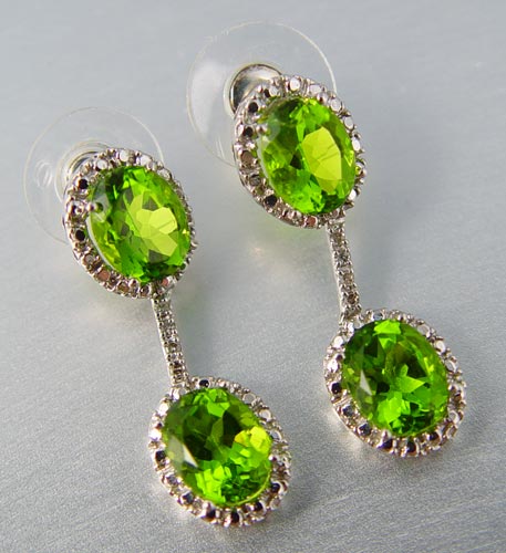 10K WHITE GOLD AND DIAMOND EARRINGS WITH GREEN STONES: 10K white gold earrings contain 4 9.00 x 11.00 mm oval unknown green stones and 8 round mixed cut diamonds. Weight: .08 Ct. Approx. The stones are prong set. Post and nut closures. 6.5 grams. 1 1/4'' length. Weight: 6.5 grams.