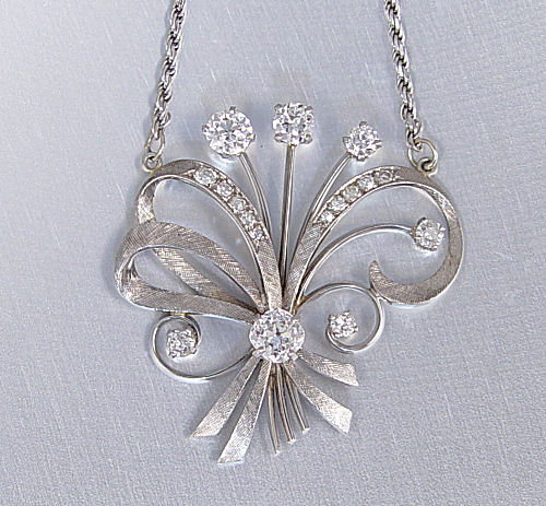MINE CUT DIAMOND FLORAL BROOCH CONVERTED TO NECKLACE: 14K white gold necklace featuring one old mine cut diamond, approx. .80 Ct., rated VS2 in clarity and I color. There are six old European round and old mine cut diamonds, approx. 1.36 Ctw., also ten round full cut and single cut diamonds, approx. .25 Ctw., VS in clarity and H-I color. The diamonds are prong and deep set. The rope chain is 14K white gold with sterling magnetic clasp. Total diamond weight is approx. 2.41 Ct. 17.2 grams. Sold with current Florida Diamond Appraisers GIA graduate's appraisal for $6975, sold at no reserve.