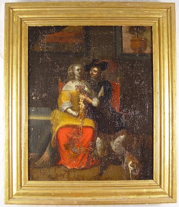 VERY EARLY OIL ON CANVAS PAINTING OF A COURTING COUPLE: 22 3/4'' x 17 1/2'', encased in a gold gilt frame, 27 1/2'' x 23 1/2''. Condition: Extensive restoration and damage, needs work.