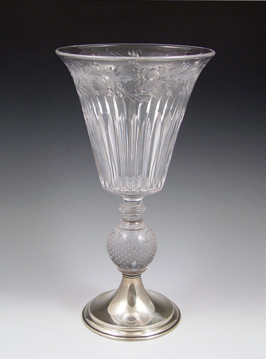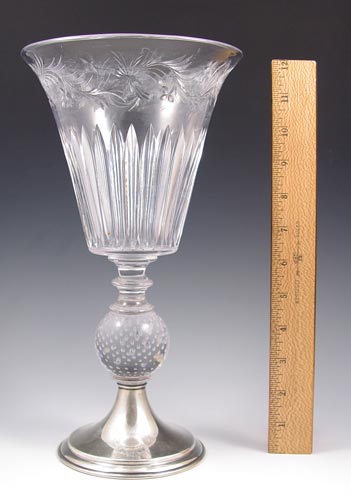 SIGNED HAWKES STERLING MOUNTED CUT GLASS VASE: Sterling base, control bubble stem, intaglio cut trumpet vase. Some cloudiness to the interior. T.G Hawkes Company, Corning New York. Measures 12 1/8'' high x 6 1/2'' top dia.