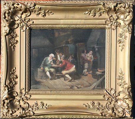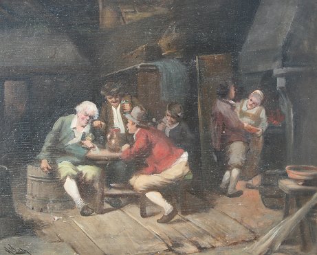 WINTER, Hans, (Austrian, 1853-1944): Interior Tavern Scene, Oil/Wood Panel, 10'' x 12 1/2'', signed, embossed period carved and gilded gesso frame with wear and missing gesso, 19'' x 21 1/2''.