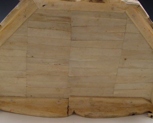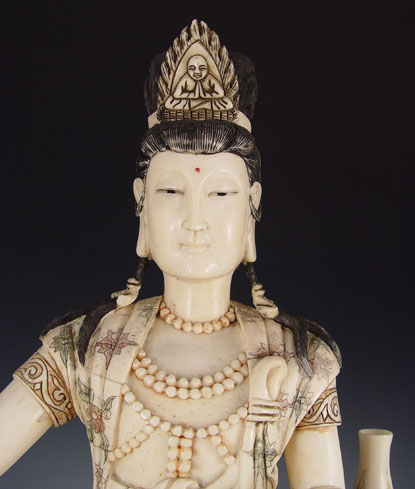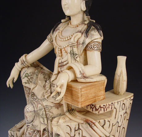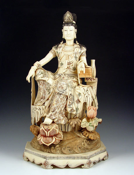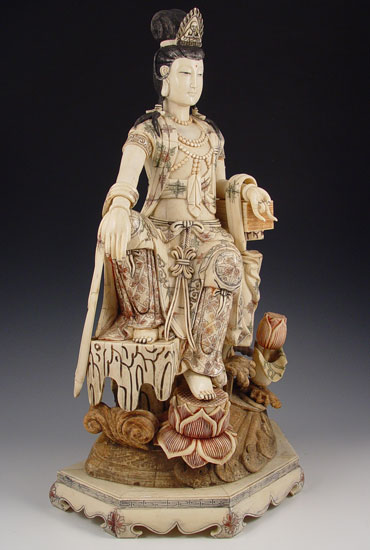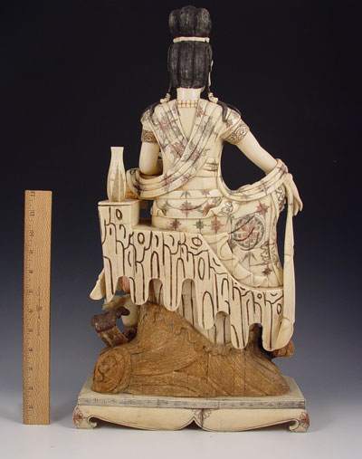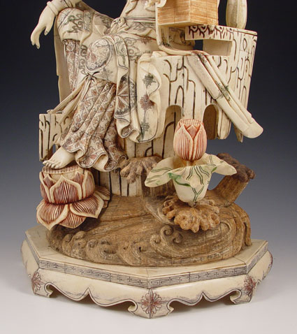 CHINESE CARVED BONE SEATED QUAN YEN WITH LOTUS FLOWER AND VASE: Detailed scrimshaw. Measures 21 1/2'' high x 13'' x 7 1/2''