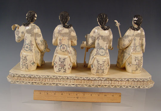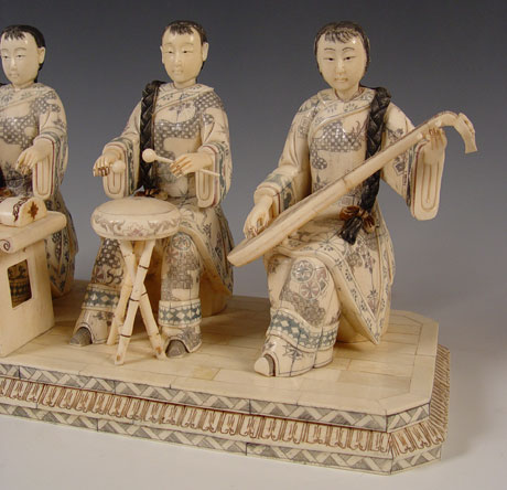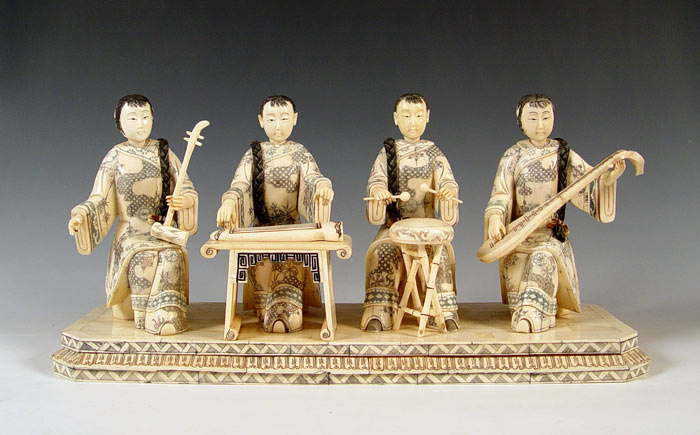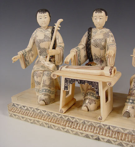 CHINESE BONE CLAD FIGURAL GROUP OF MUSICIANS : Detailed scrimshaw. Measures 10'' high x 22'' x 8''