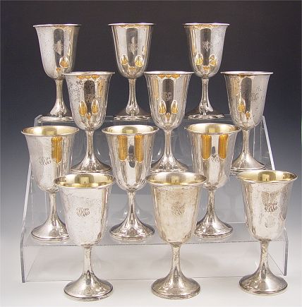 12 WATROUS MFG. STERLING GOBLETS: Monogrammed, note dents in several, lacquered. Measure 6 1/2'' high x 3 1/2'' dia. Approx 39.1 troy oz.