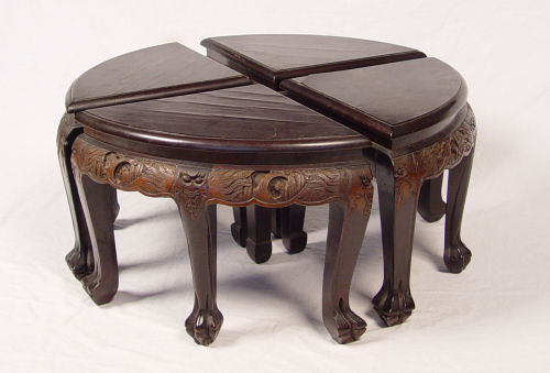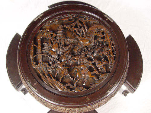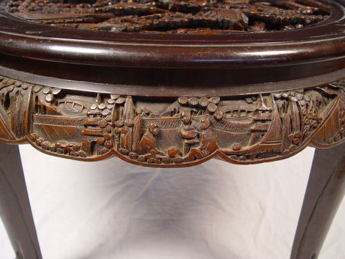 DEEPLY CARVED CHINESE CHOW TABLE WITH 4 STOOLS: Low table with carved sides and carved top under glass. Table measures 21'' high x 32 1/4'' dia.. Pie shaped stools measure 13 1/2'' high x 18 3/4'' across.