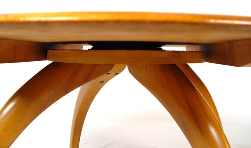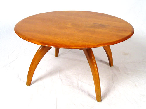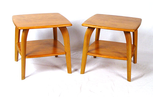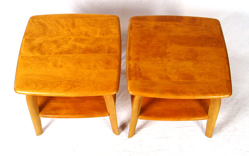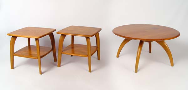 HEYWOOD WAKEFIELD END TABLES AND LAZY SUSAN COFFEE TABLE: End tables measure 20 1/2'' high x 21'' square. Coffee table measures 16 1/4'' high x 32'' dia.