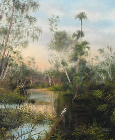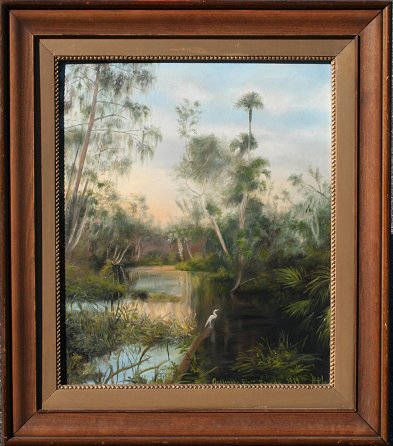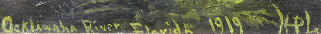 EARLY FLORIDA ''OCKLAWAHA RIVER'' PAINTING 1919: Oil/Board, depicts a peaceful Florida river landscape with white heron, titled and dated 1919, monogrammed HPL?, 18 1/2'' x 15 1/2'', wooden frame 24'' x 21 1/2''. Est. $500/800**