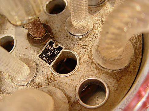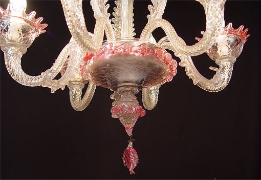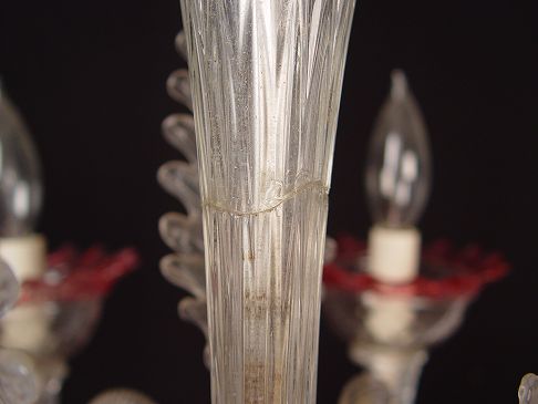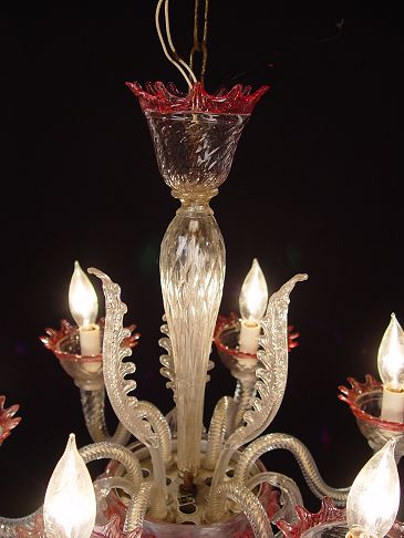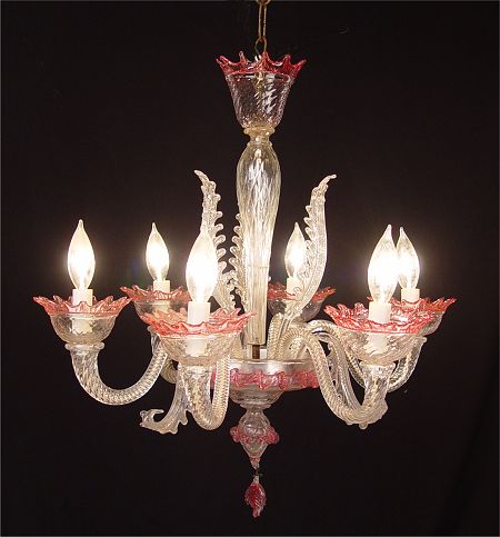 DIMINUTIVE VENETIAN CRANBERRY GLASS CHANDELIER: Cranberry rimmed glass, 6 light on curved arms, enhanced with stylized leaves. Please note crack to center stem section. Approx. 21''dia., 23''h. including lower center prism.