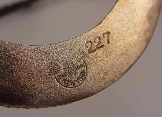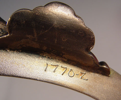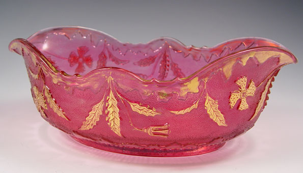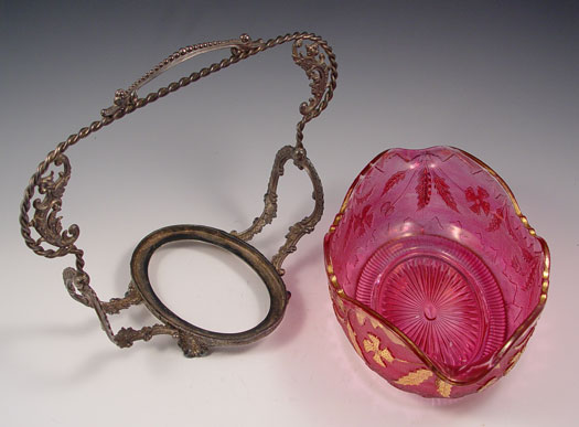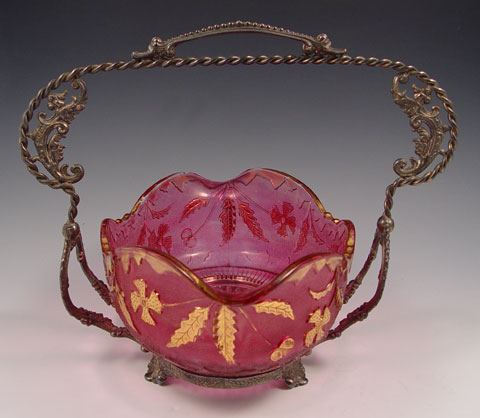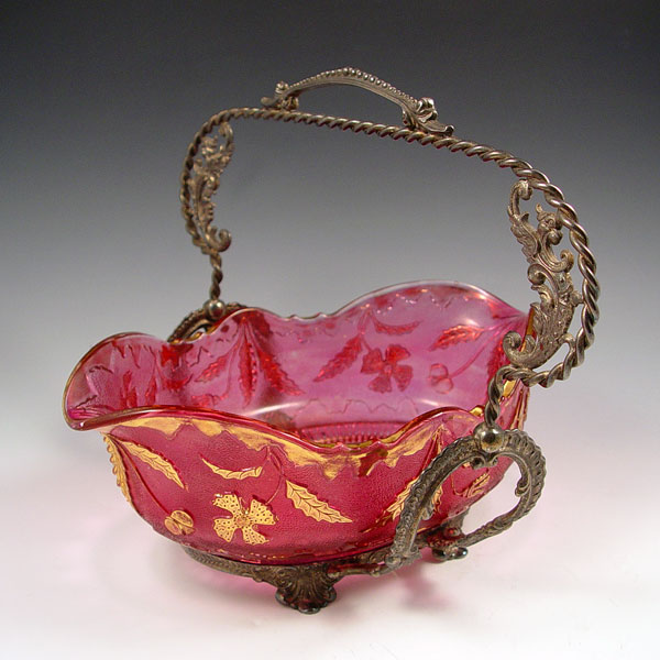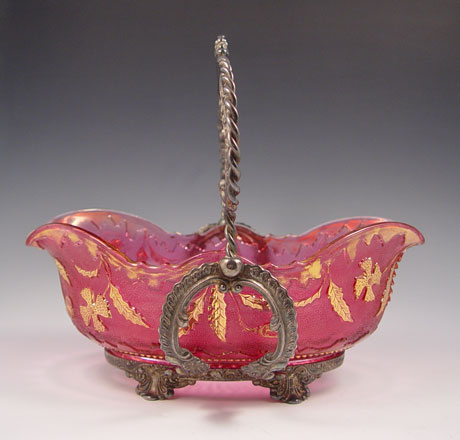 VICTORIAN BRIDES BASKET: Flashed cranberry glass in an embossed and gilt thistle pattern. Dragon motif silverplated holder. The bowl is 11 1/2'' long. The frame is 9 1/2''h. x 12 3/4''.