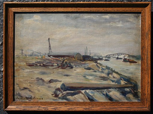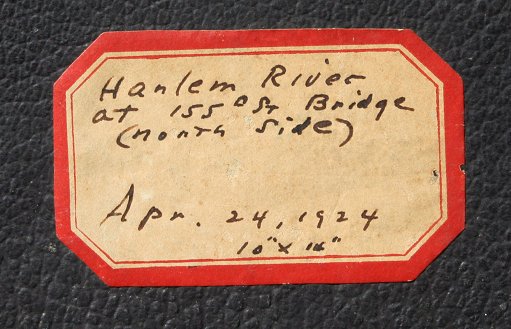 BROWN, Everett S. (American): Harlem River at 152nd Street Bridge (Northside). April 24, 1924. Oil/Canvas board 10'' x 16''. Signed and titled verso. Oak frame, 11 1/2'' x 15 1/2''. Condition: Needs cleaning.