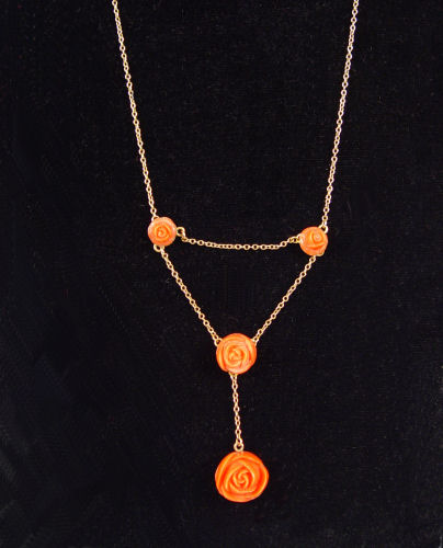 14K ANTIQUE CARVED CORAL NECKLACE CA. 1900-1910: 14K yellow gold Arts & Crafts coral necklace contains 4 carved pieces of coral carved as roses. The coral is glued to 14K plates that are strung with anchor link chain. Approx. 18'' Weight: 3.5 grams.