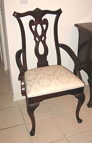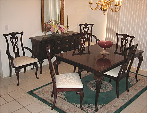 THOMASVILLE DINING TABLE AND 6 CHAIRS: TABLE with Queen Anne style legs, carved knees, measures 29 1/4'' high x 62'' long x 44'', 102'' long with the pair of LEAVES in use, pads included. Set of 6 pierce carved Chippendale style CHAIRS, 2 captain, 4 sides, captains measures 42'' high x 22 3/4'' x 22''. Excellent condition.