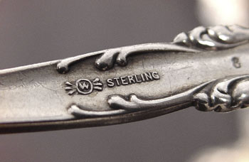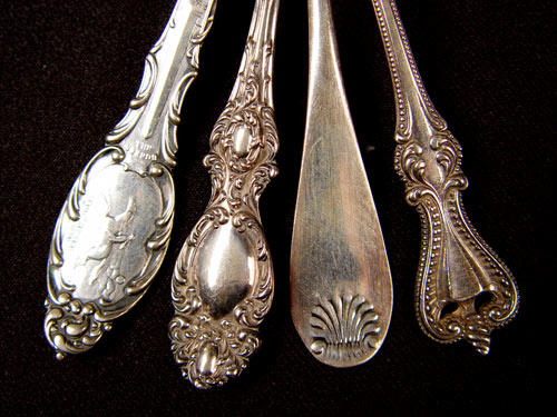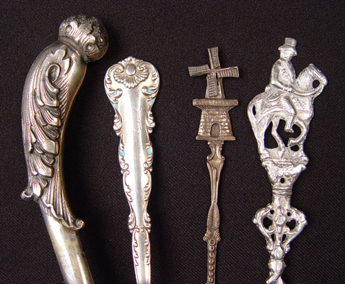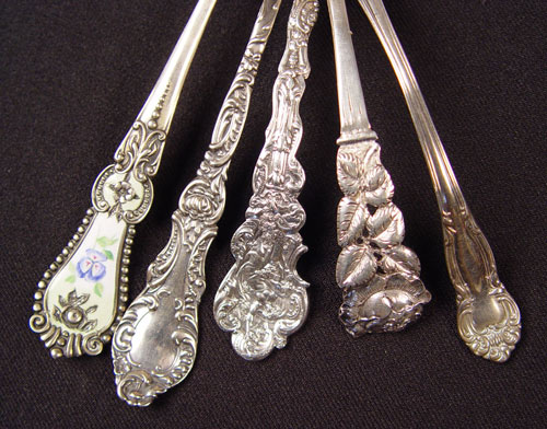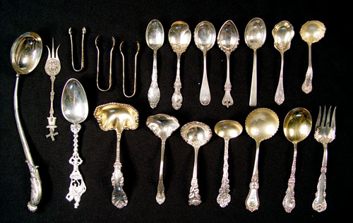 COLLECTION OF STERLING SERVING PIECES: 20 assorted serving pieces to include 6 sterling cream ladles, 5 sterling sugar scoops, 3 sterling chicken feet sugar tongs, table spoon, cold meat fork and souvenir spoon. Assorted makers and patterns including Towle, Whiting, Wallace, Kirk & Son, Gorham. Approx 18.4 troy oz. Also includes large German 800 silver ladle (12 1/2'', 4.6 troy oz), Dutch .833 souvenir windmill fork (7 1/4'', 1.3 troy oz), and unknown metal content figural spoon (8 3/4'').