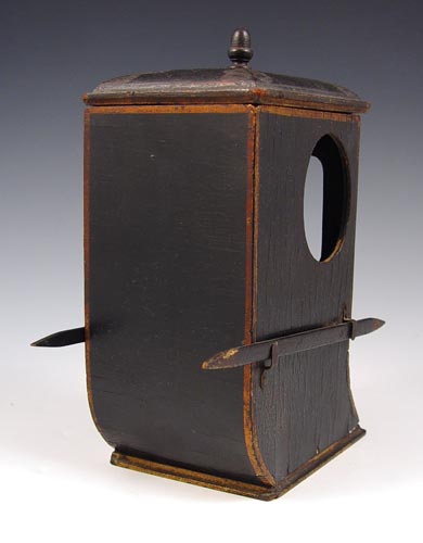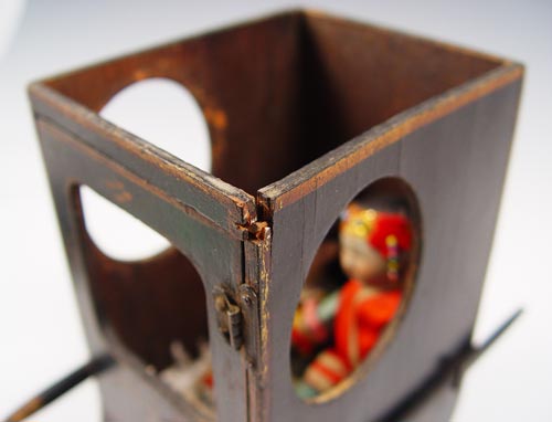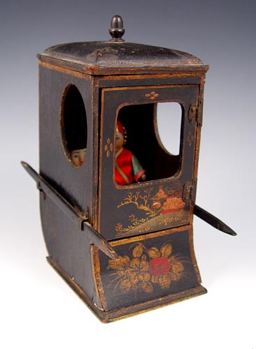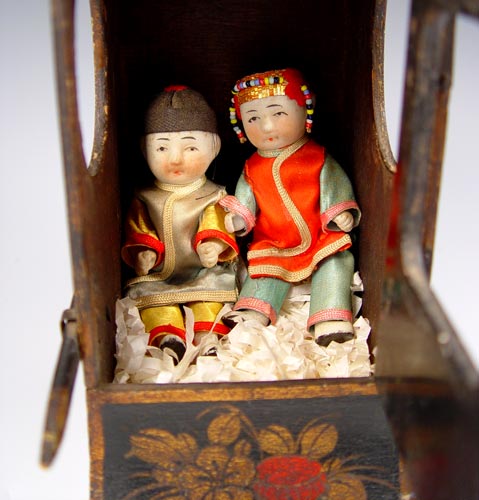 MINIATURE CHINESE BRIDAL SEDAN WITH DOLLS: Handpainted and decorated wood carrier with hinged door. The fully dressed dolls are 3 1/2''h. The sedan is 6 1/4''h.