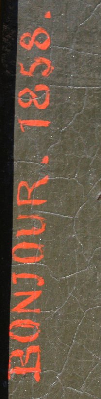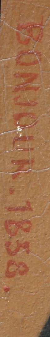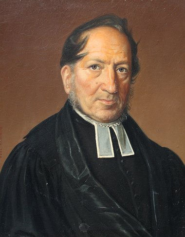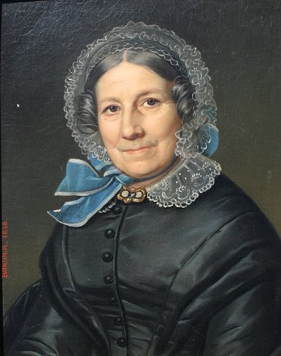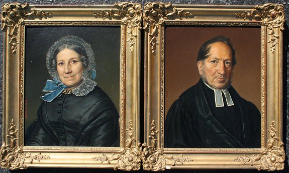 BONJOUR, Jean Baptiste, (French, 1801-1882): (1) Oil/Canvas laid on board, portrait of an elderly woman in a bonnet, 15 1/2'' x 10 7/8'', signed and dated 1858, encased in gilded and carved embossed gesso frame with minor wear, 18'' x 15 1/2''. (2) Oil/Chamfered Wood Panel, portrait of the minister, 14 3/8'' x 11 1/4'', signed and dated 1858, encased in matching gilded embossed gessoed frame with minor wear, 18'' x 15 1/2''. Condition: Woman has been laid down, small fleck to left margin, several minor abrasions, paint fleck in scarf, spider cracklure throughout. Man has spider cracklure throughout, needs cleaning. Est. $1000/2000**