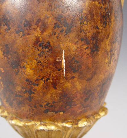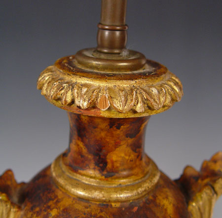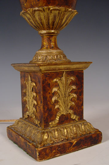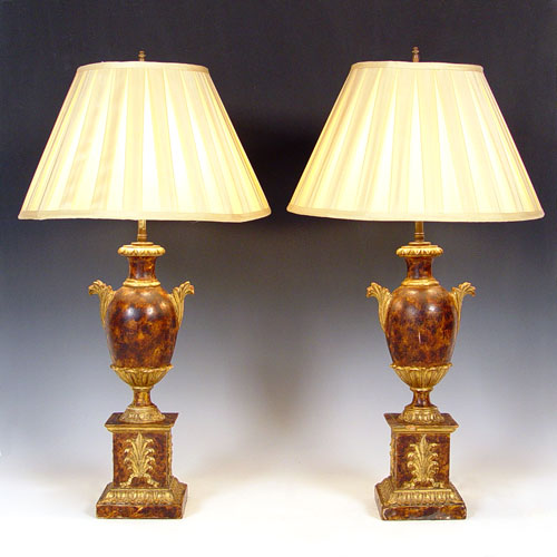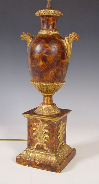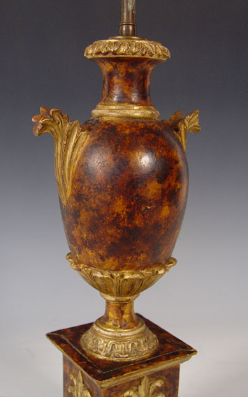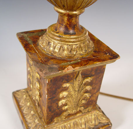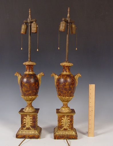 19TH CENTURY CARVED & GILT WOOD LAMPS: Tortoise finish. Base measures 11'' high x 5 3/8'' square. 29 1/2'' high overall.