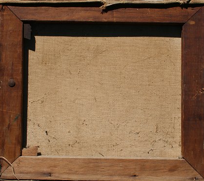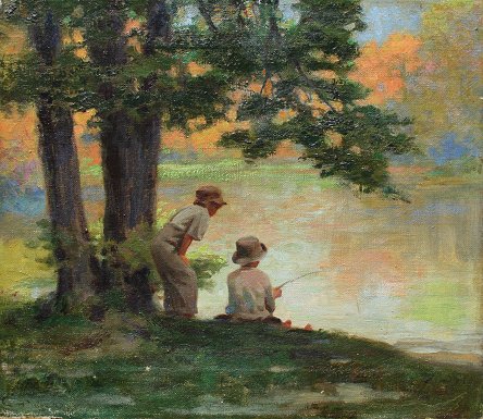 AMERICAN IMPRESSIONIST PAINTING OF BOYS FISHING: New Hope?, Oil/Canvas, two young boys fishing along a riverbank, 13'' x 15''. Illegible remnants of a signature on lower left. Period frame with wear, 15 1/2 x 17 1/2. Est. $500/800**