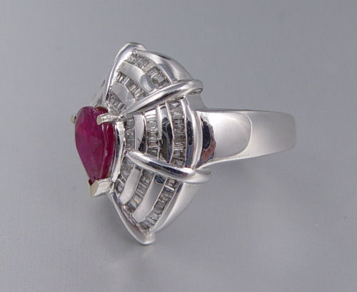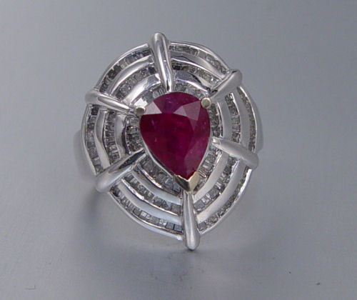 2.25 CT RUBY RING WITH DIAMONDS: 14K white gold ring contains one pear shaped mixed cut ruby Weight: 2.25 Ct. Approx. Rated I1 in clarity (Type II), slpR in Hue, 6 in Tone and 3-4 in Saturation. 113 straight and tapered baguette cut diamonds. Weight: 1.13 Ct. Approx. Rated I1-I2 in clarity and I-J in color. The ruby is prong set. The diamonds are channel set. Weight: 9.3 grams. Size: 7 Est. $500/600**