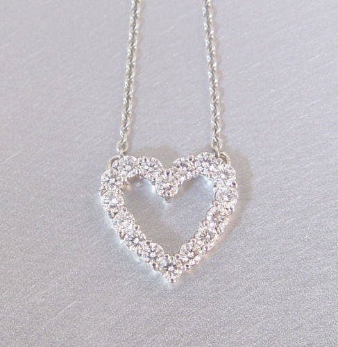 18K 1.00 CT. DIAMOND HEART NECKLACE: 18K white gold heart shaped diamond necklace contains 16 round brilliant cut diamonds. Weight: 1.00 Ct. Approx. The diamonds average VS in clarity and G-H in color. The diamonds are prong set. Anchor link chain. Weight: 6.4 grams. Length: 16''