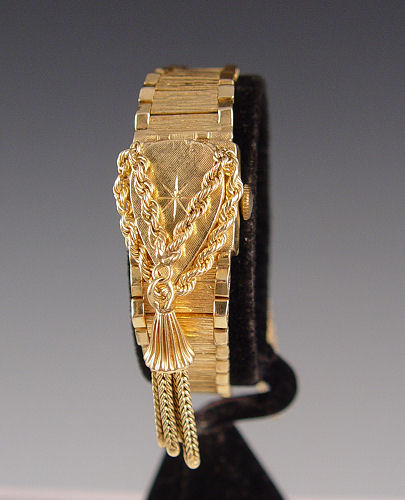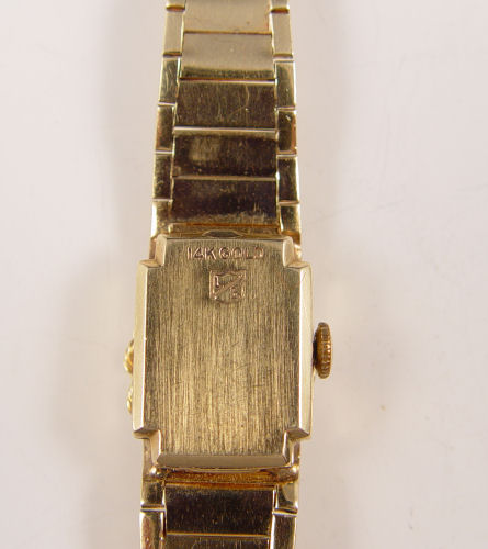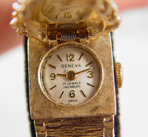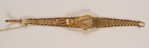 14K GOLD GENEVE LADIES PEEK-A-BOO WATCH: 14K gold watch, 17 jewel mechanical Swiss movement. Integrated band with flip over clasp with safety chain. hinged cover over dial, Peek-A-Boo Art Deco design. Ca. 1970. 6'' long. Approx. 28.6 grams.