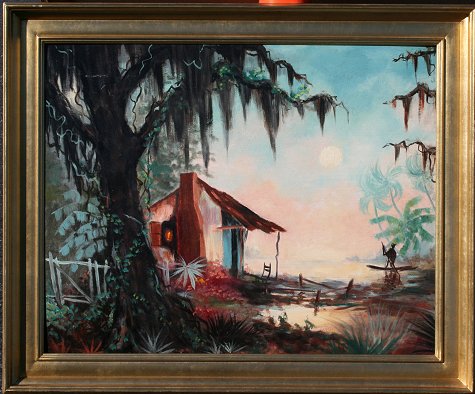HENRY, William, (American, 20th C.): Dockside Swamp Shack, OIL/Board, unsigned, framed, 24'' x 30''. No visible signature. Gold frame, 29 1/2'' x 35 1/2''.