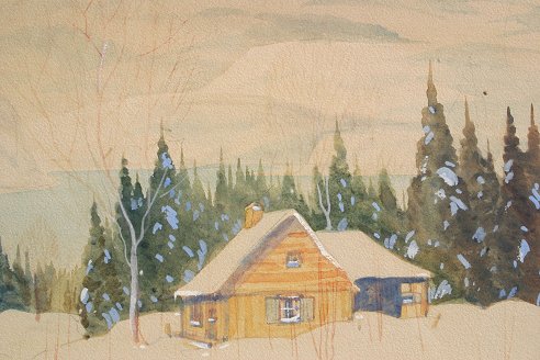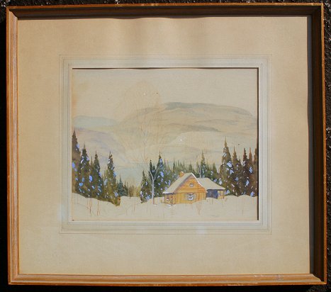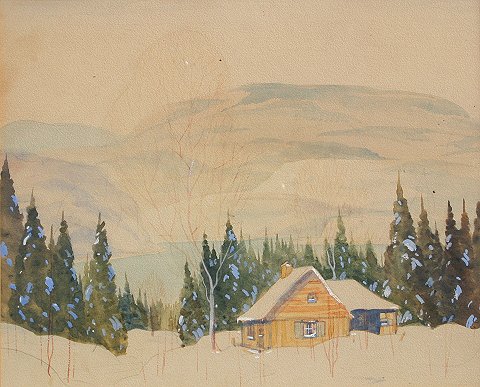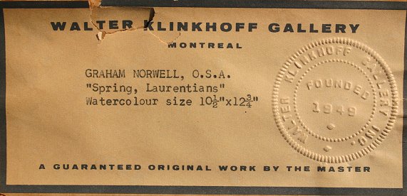 NORWELL, Graham Noble, (Canadian, 1901-1967): ''Spring, Laurentians, W/C on board, 10 1/2'' x 12 3/4'', no visible signature, Walter Klinkhoff Gallery label verso, light wood frame, 19'' x 21 1/2''. Faint mat burn in side margins, 2 residue spots (gummy dirt).