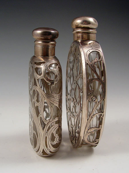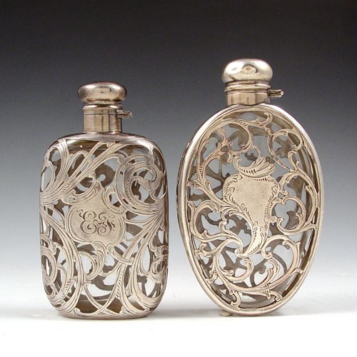 2 FINE SILVER OVERLAY FLASKS: To include 1) Alvin .999 fine silver with rounded bottom. No monogram. Measures 5 1/2'' x 3 1/8''. 2) .999 fine silver, no makers mark, monogrammed. 4 1/2'' x 2 3/8''.